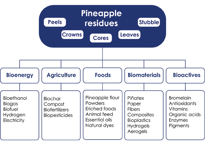 Pineapple residues, rich in lignocellulosic fibers, sugars, and bioactive compounds, present diverse opportunities for value-added applications (Amores-Monge et al., 2022). For example, fibers from pineapple crowns are used to produce Piñatex®, a plant-based leather substitute widely adopted in the fashion industry, developed by Dr. Carmen Hijosa (Dhanda et al., 2024). Additionally, pineapple peels, rich in antioxidants and fermentable sugars, are now being transformed into bioethanol, biogas, and biochar, contributing to both renewable energy generation and sustainable agriculture (Sarangi et al., 2023). Residues also contain bromelain, a proteolytic enzyme with potential applications in sectors as diverse as food processing, pharmaceuticals, and cosmetics (Kansakar et al., 2024).