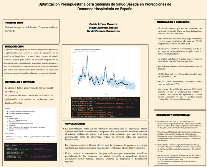 Este artículo presenta un modelo integrado para la optimización presupuestaria en sistemas de salud, que combina técnicas de pronóstico de demanda hospitalaria con programación lineal para la asignación eficiente de recursos. La pandemia de COVID-19 evidenció limitaciones en la capacidad de los sistemas sanitarios para responder a incrementos abruptos en las hospitalizaciones, resaltando la necesidad de herramientas cuantitativas que apoyen la planificación anticipada. La metodología propuesta se basa en dos componentes complementarios. Por un lado, se emplean modelos de series temporales para proyectar la evolución de las hospitalizaciones a corto plazo, identificando tendencias y patrones estacionales. Por otro, estas proyecciones se integran en un modelo de optimización lineal que determina el número óptimo de camas hospitalarias a financiar, considerando restricciones presupuestarias, costos unitarios, proporciones mínimas entre camas generales y de cuidados intensivos, así como requerimientos operativos básicos. El enfoque se valida mediante un caso de estudio con datos reales de hospitalizaciones por COVID-19 en España, obtenidos de fuentes oficiales abiertas. Los resultados muestran que la demanda proyectada se mantiene en niveles moderados y relativamente estables, lo que permite identificar configuraciones de asignación de camas económicamente viables y operativamente eficientes. En conjunto, la integración de modelos predictivos y herramientas de optimización se consolida como una estrategia robusta para fortalecer la planificación hospitalaria en contextos de incertidumbre. El modelo propuesto facilita la toma de decisiones informadas, transparentes y justificables, contribuyendo a una gestión más eficiente del presupuesto y de la capacidad hospitalaria en sistemas de salud contemporáneos.